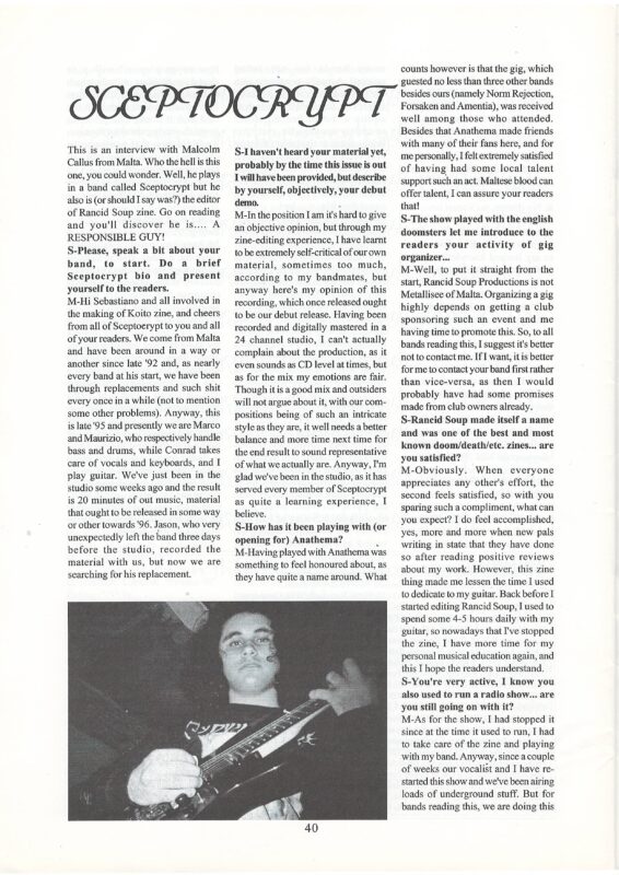 With Sceptocrypt’s return since 2023, we are currently looking for reviews for our never promoted 1999 recording “!26hrs 72mins … the need to differ)” as well as our latest 2023 & 2024 new music.Some interviews would also be welcome, so we look frwd to hear from you media lot. The 1st interview was during a Maltese podcast Rockna, a nice chat with host Michael about the latest in the world of Sceptocrypt & what we got stored in the pipeline. Audible at https://netondemand.mt/play/16458, the Maltese show switches to English while interviewing Sceptocrypt in its 2nd part. More airplay, reviews & interviews will be posted at www.sceptocrypt.com/category/press. Any interested media can contact us via the same page.